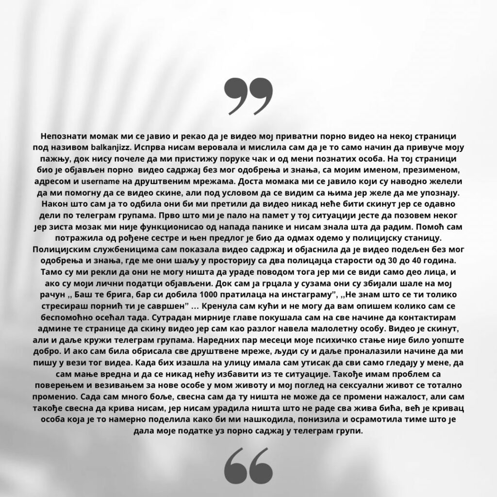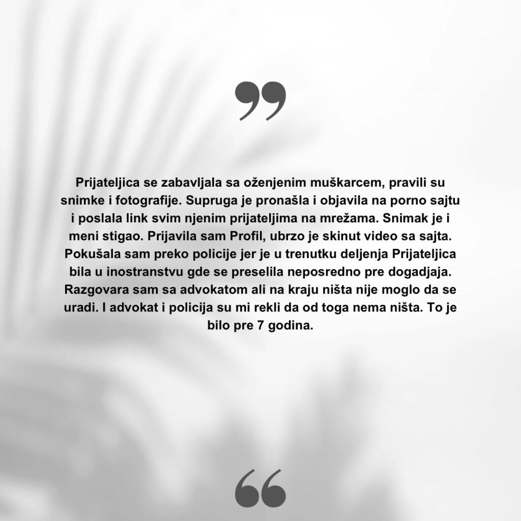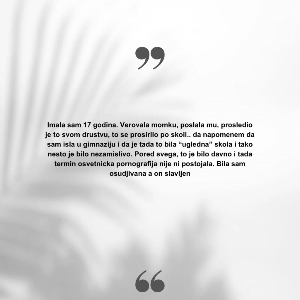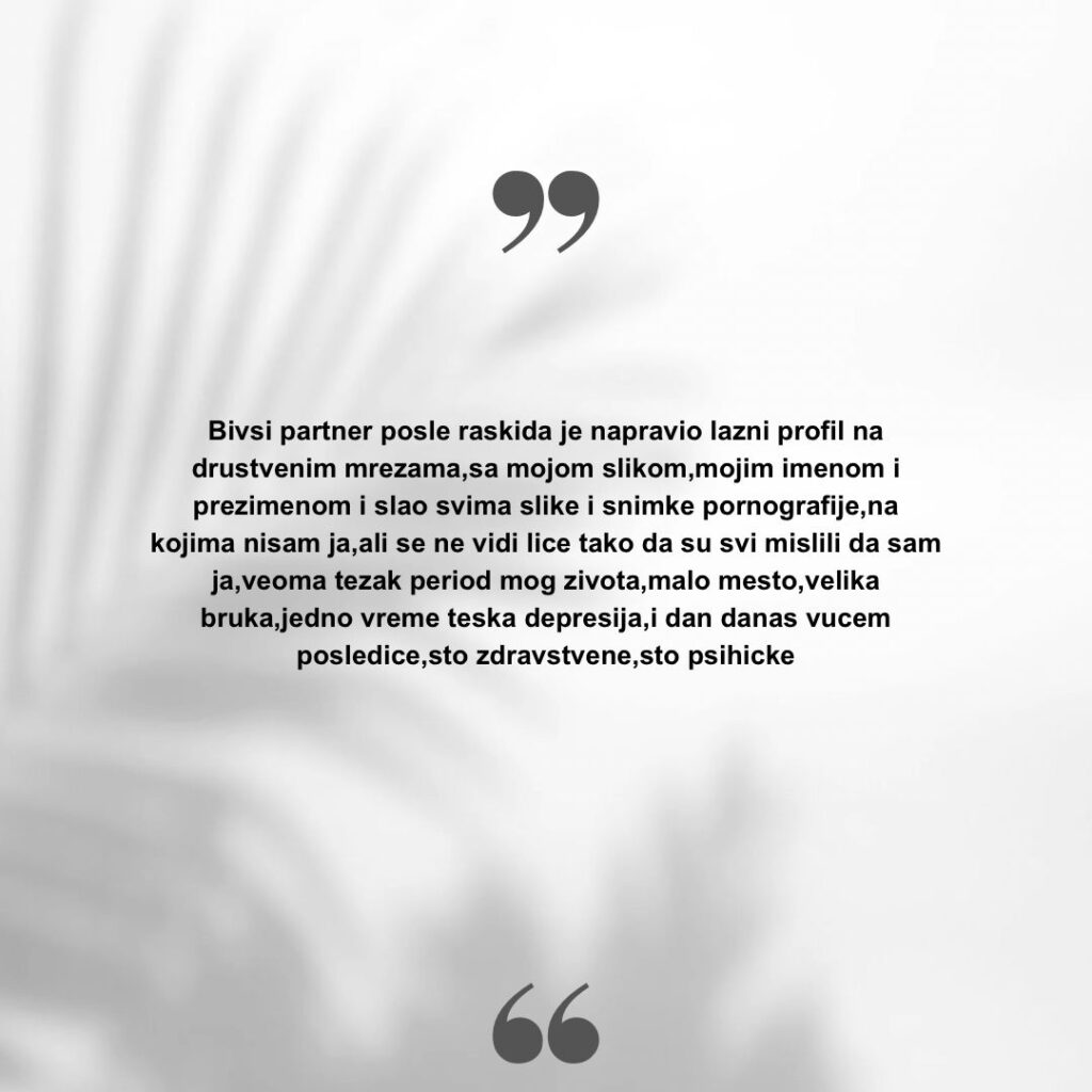 “Pišem vam iz razloga što sam pročitao vaš blog na temu osvetničke pornografije i želim da podelim moje iskustvo sa vama kako biste bolje prepoznali problem i načine borbe protiv ovakvih i sličnih društvenih problema.